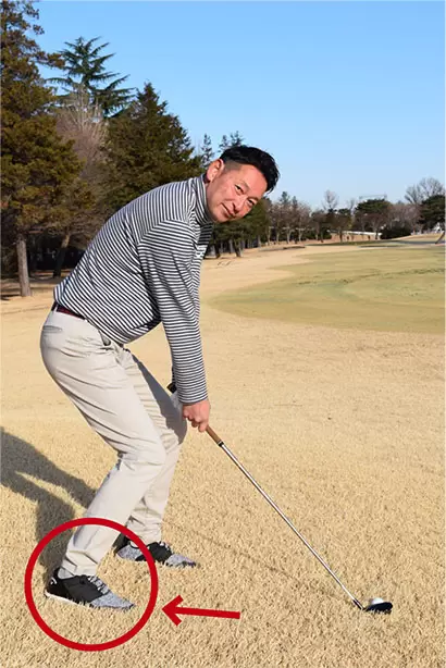 スクエアスタンスから右足を後ろに引いてクローズスタンスに構える。こうするとテークバックでクラブがスムーズに上がる