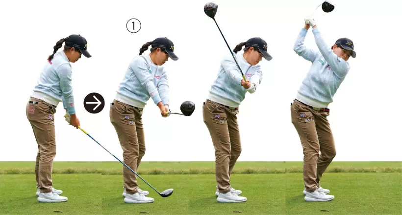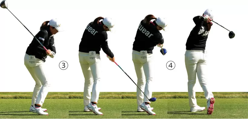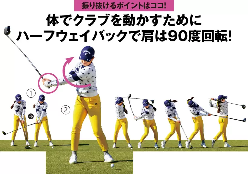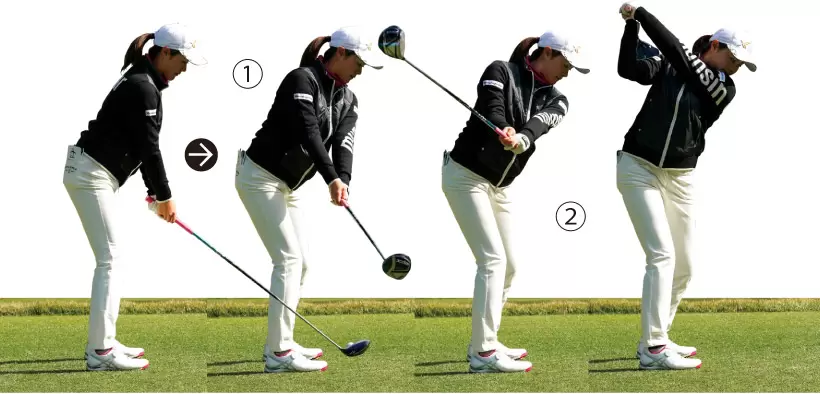 テークバックで右手首の甲を上向きにしてしまうことで、ダウンスイングフォローにかけて手首を回して球をつかまえにいく動きが出てくる。トップで右手の甲を頭の方に向かせるだけで、もっとシンプルなスイングになる。
