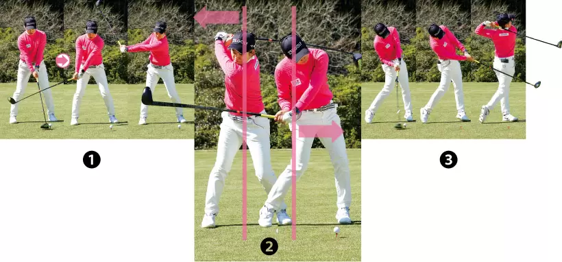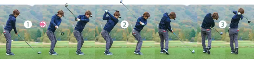 ①手元に力が入っていたら、ヘッドを吊りながら上げることはできない。 ②右ヒジを曲げる分、ヘッドはクロスになるがダウンスイングでしっかり腰を回すことでヘッドは軌道に乗る。 ③右カカトは地面から離れるが、頭を動かさずにヘッドと引っ張り合わせることで最大の遠心力を生む。