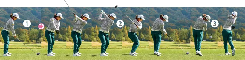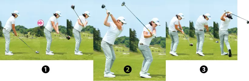 ①アドレスで手元が体の中心にあ ることで、スイングにおいての左右のバランスが取りやすくなる。 ②手元がまだ腰にある段階で、トップでの手首の形は完成 ③手首の形はそのまま、両肩を回すだけで力のたまるトップが作れる