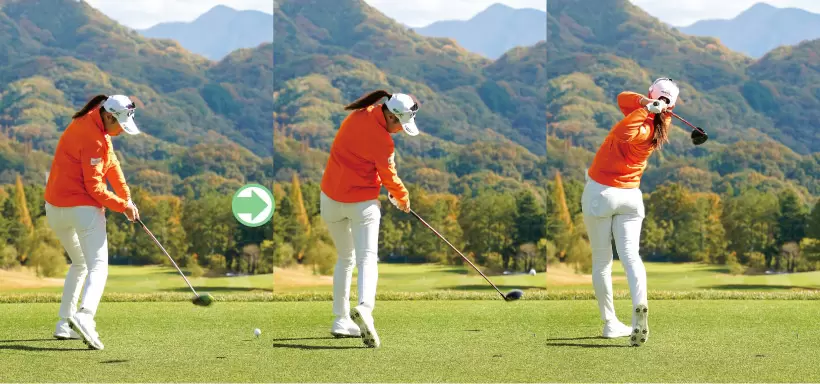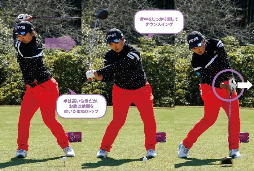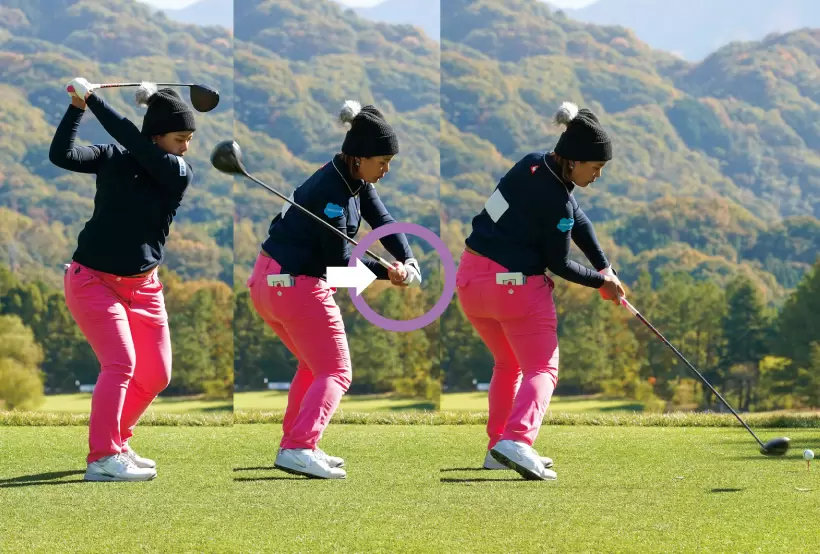 トップから背中が動き続けるから、ダウンスイングで少し手元が浮いているように見えても、インパクトではしっかりとヘッドを戻すことができ、つかまる球が打てる。