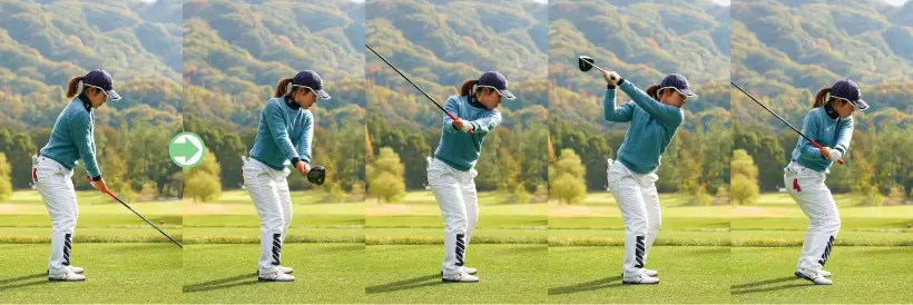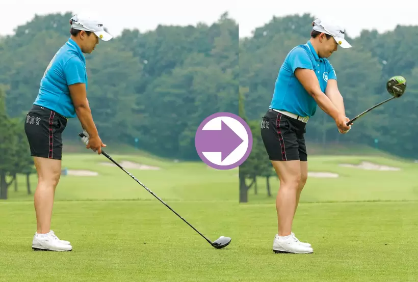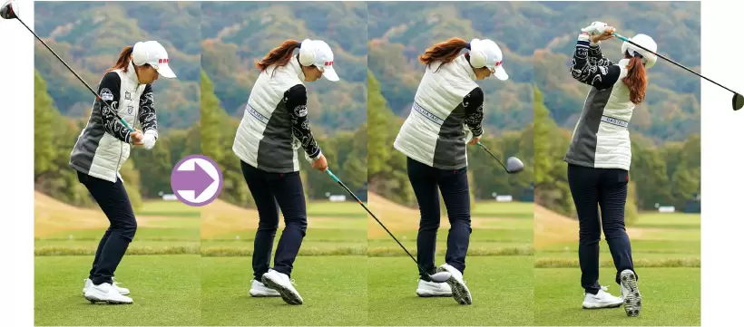 ヘッドの始動と共に体重移動を始める。両ワキを締めながら上げることでフェースはシャットのまま上がる。