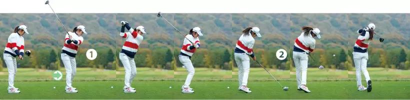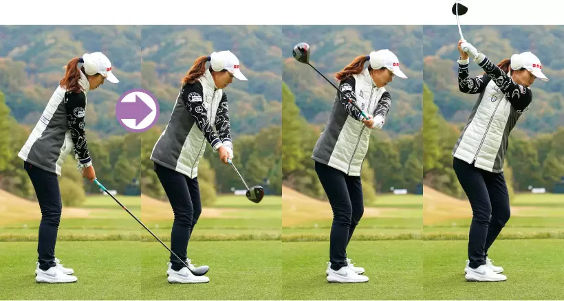 ①両ヒジを曲げながらテークバックすることで、クラブの重さをより感じることができる。 ②カカトで地面を押し続けるような動きで、前傾角度をキープしている。