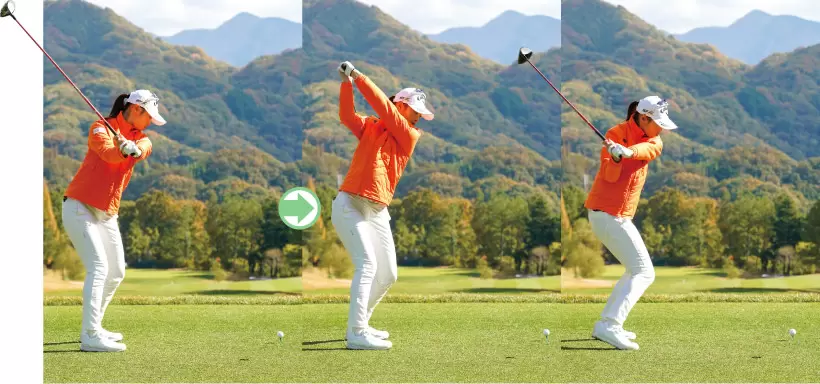 ①力を込めてグリップを握ると、肩は動いてしまうから、イカリ肩にならないように意識する。 ②胸の向きはそのままにクラブだけ下ろす ③無理な体の動かし方をしないことが、飛距離にもつながる。