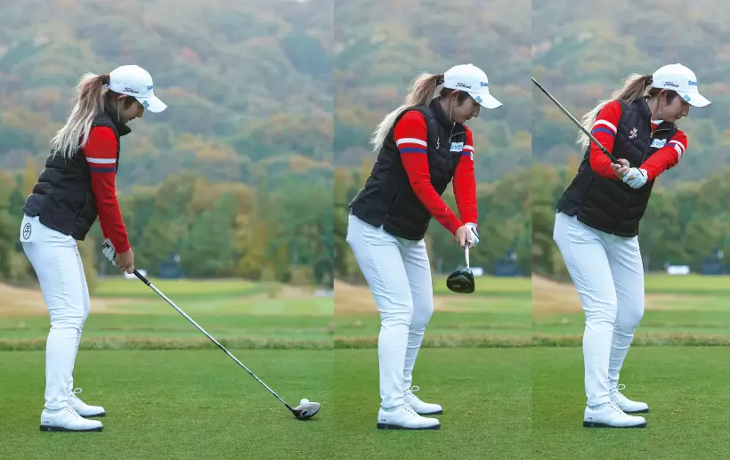 トップで左ヒザが大きく屈伸することで、 体の軸はそのままに大きく右に体重移動 している。そこからヒザの高さを変えない ダウンスイングで体の上下動も無くして 安定したショット力を生んでいる。