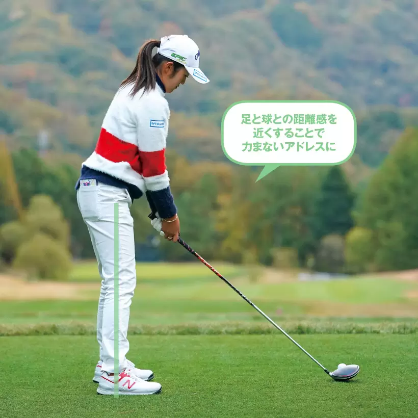 足と球との距離感を近くすることで力まないアドレスに