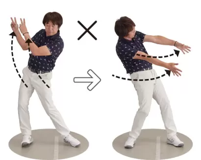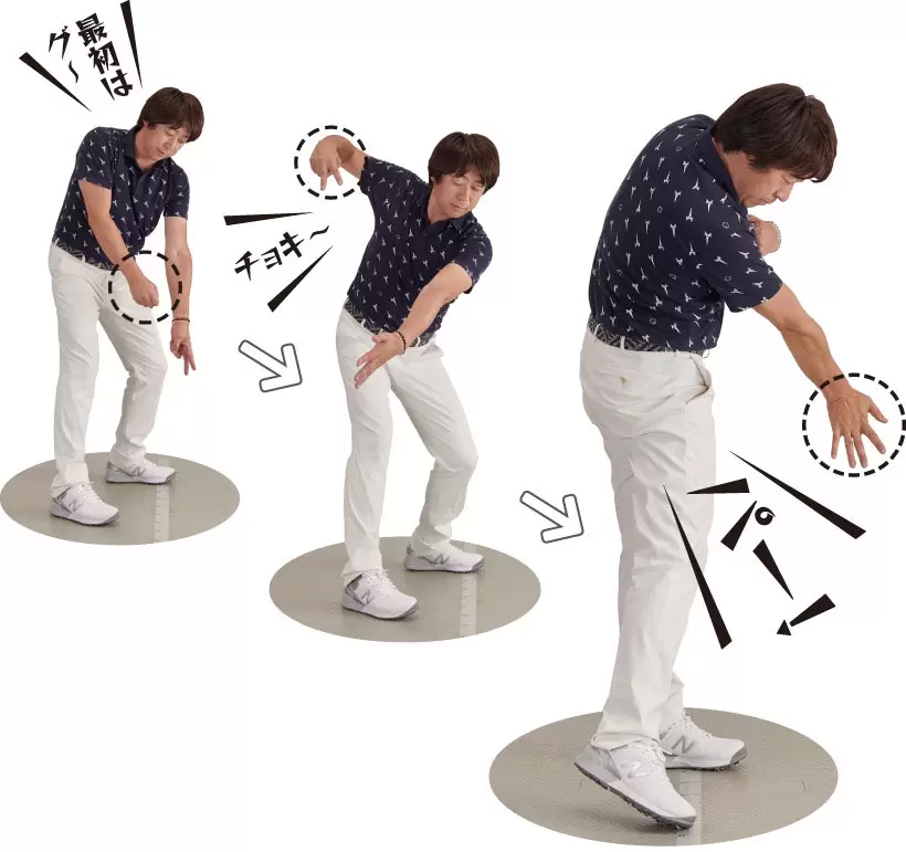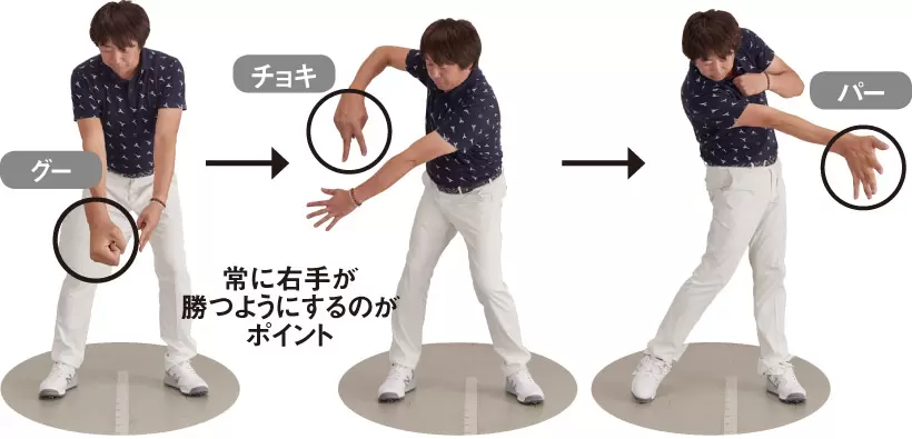 「グーチョキパードリル」では、 ジャンケンで常に右手が勝つ ようにするのがポイント。また、 肩甲骨を積極的に動かすこと で、左右の手を動かすことも 重要。最初はゆっくり行ない、 徐々に速くできるようにしよう。