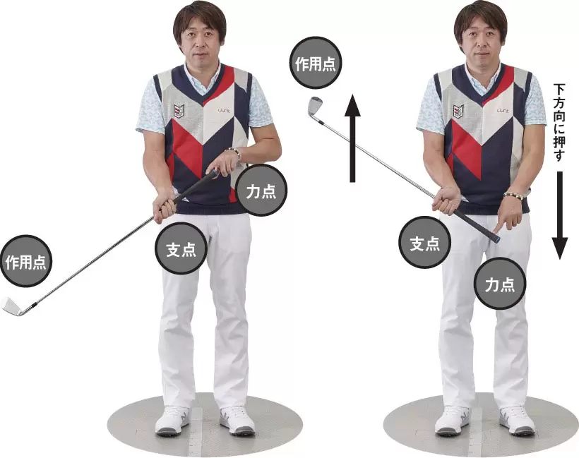 ゴルフスイングでは、クラブを持つ右手が「支点」になる。「力点」は左手となり、指で押すだけの小さな力でも、テコの力で「作用点」であるクラブヘッドは大きく動く。