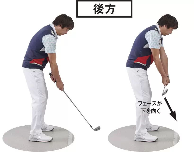 クラブフェースは腰の高さで、フェースが少し下を向く程度。つかまりを増したいときは、フェースが下を向く度合いを増やすのも有効。