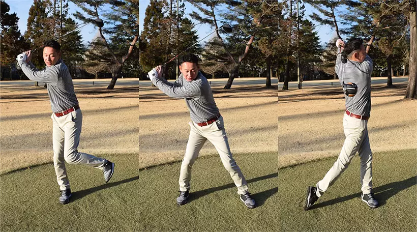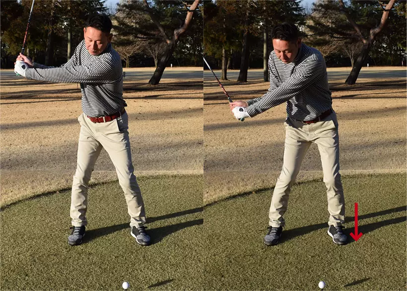 コンパクトなトップからクラブを大きく振ろうと思うと自然に左足を踏み込める