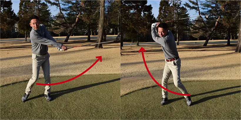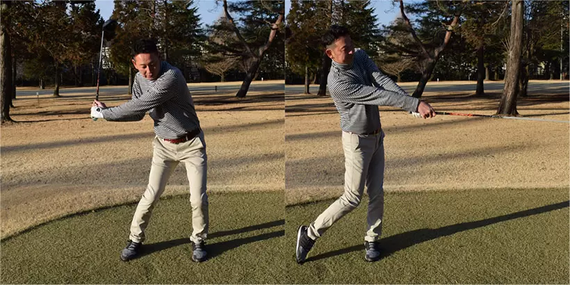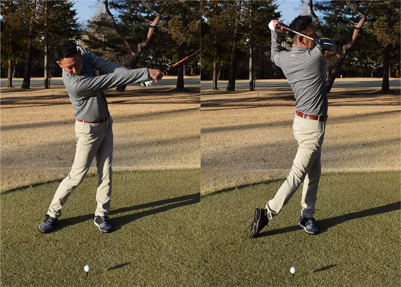 そのままダウンスイングに向かうと腰が引けてフォロースルーが小さくなりやすい