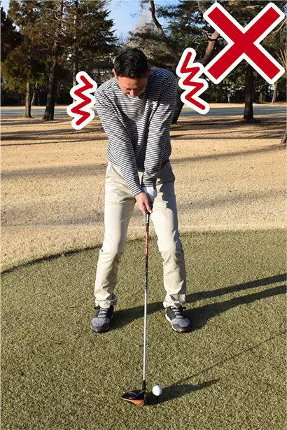 アドレスで体を完全に止めると上体も下半身も固まって、体をスムーズに動かしだすことができない