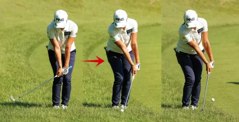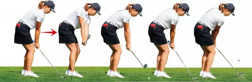 アドレスで伸ばした両腕をバックスイングからトップ、さらにダウンスイングからフォローまで伸ばしたままにすることで『手を使わないアプローチ』になっている。