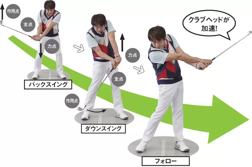 ゴルフスイングでは、クラブを持つ右手が「支点」になる。「力点」となる左手を引き上げることで、「作用点」であるクラブヘッドは一気に加速する。
