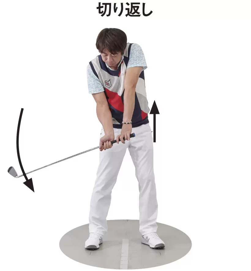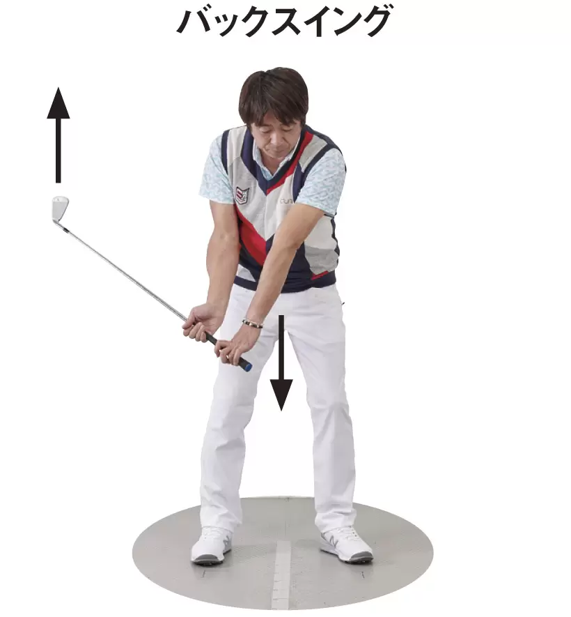 [バックスイング]右手を「支点」にして、左手を下に下げることで、クラブヘッドは上に上がる。