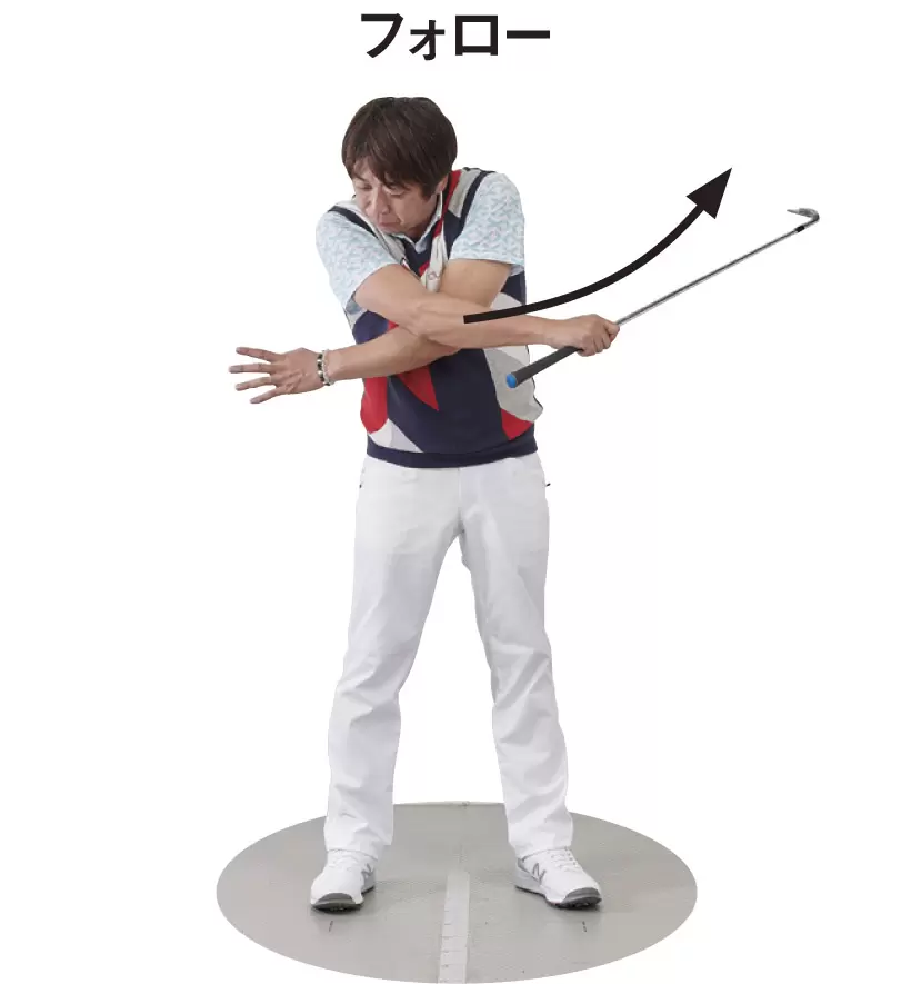 [フォロー]引き上げた左手を放して、ヘッドを走らせる。フェースが閉じながら、クラブヘッドが走り、斜め上にむかう。