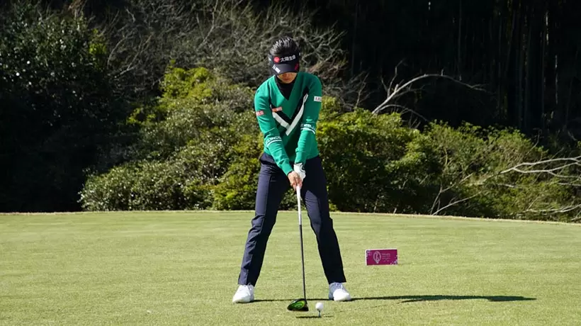 スタンスは狭め。ボール位置は左カカトよりやや内側
