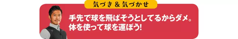 手先で球を飛ばそうとしてるからダメ。体を使って球を運ぼう!