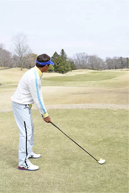 ティアップを低めにし、ドライバーよりもボールを1個内側にセット