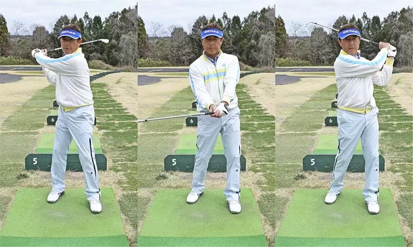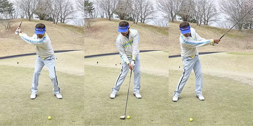 クローズスタンスで水平素振りを繰り返すと軸を安定させてスイングする感じがすぐにつかめる。ショット前の素振りとしても効果的だ