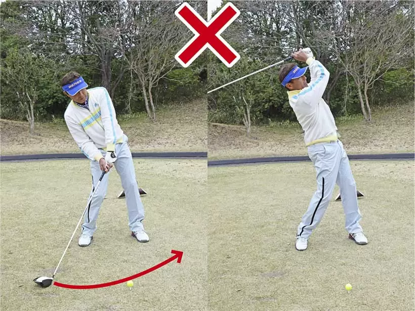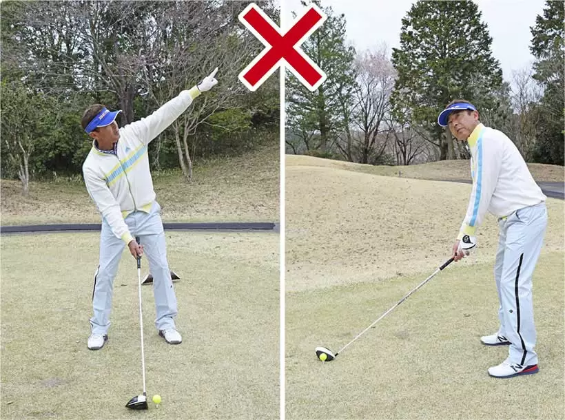 右肩下がりの構えとなるため、すくい打ちの結果となってチョロやダフリが生じやすい。