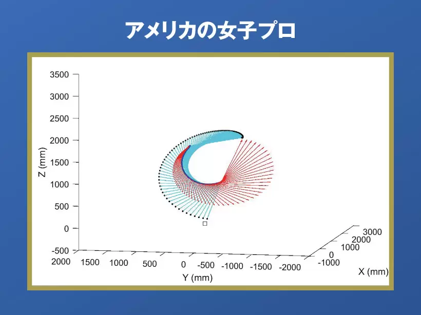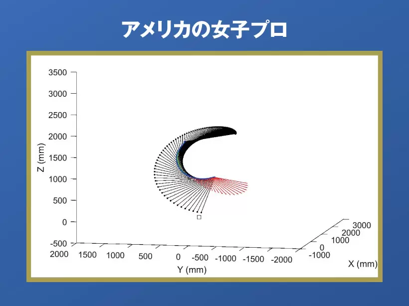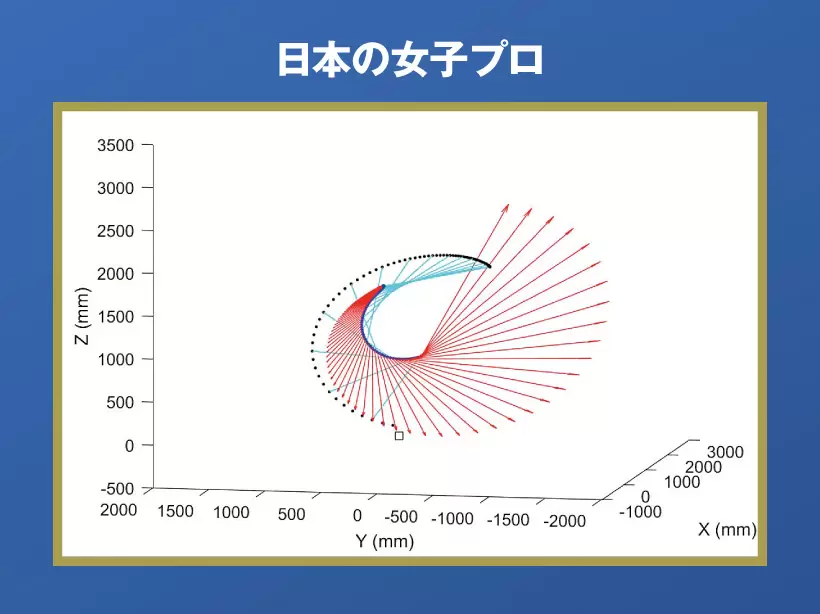 左の日本の女子プロと比べてβフォースの大きさを示す赤い矢印が小さく、発生タイミングも遅い。