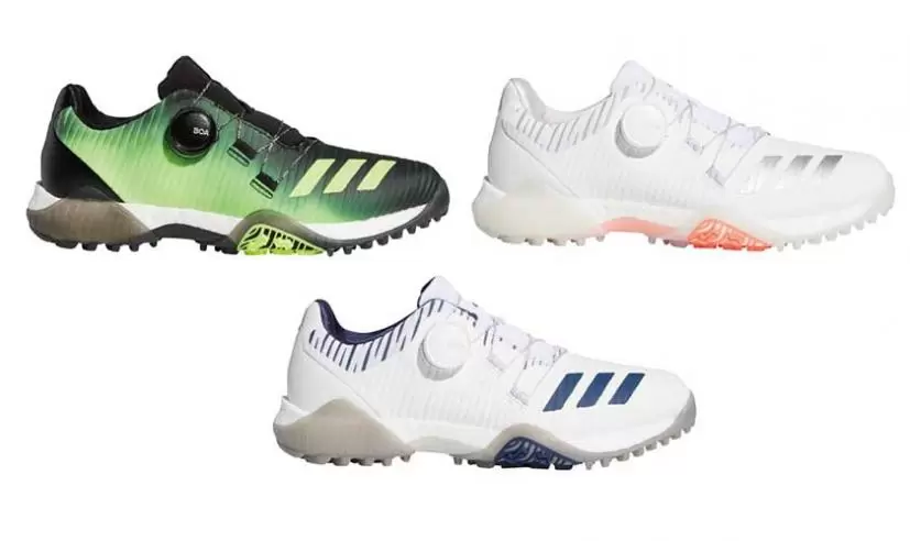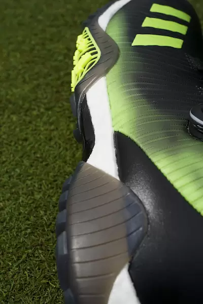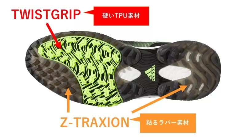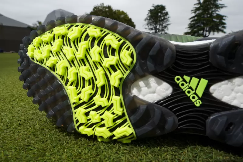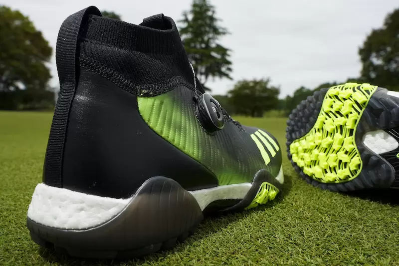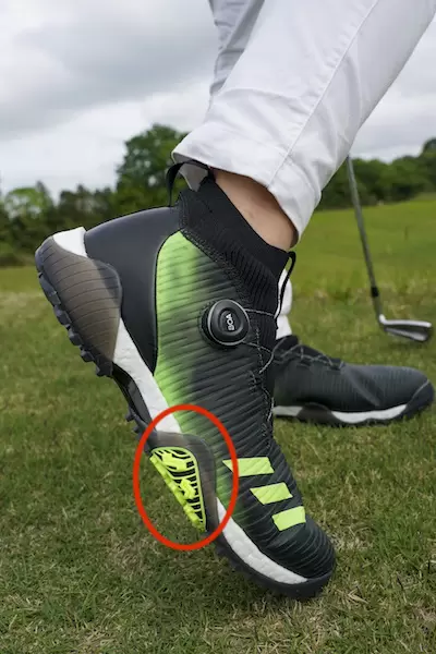 ミッドソールを包むように配されているのが「コントロールラップ」。これが「BOOST(TM)」のクッショニング性能とのシナジー効果を発揮し、スイング時の足元を支えてくれる。