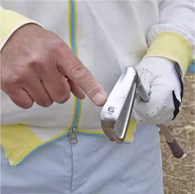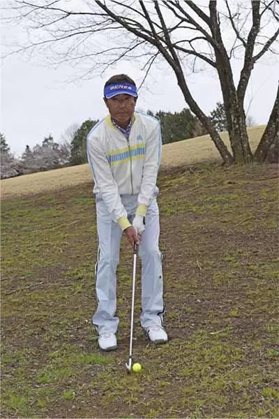 ボールをスタンスの中央付近に置き、両手を左モモのツケ根の前にセットして軽くハンドファーストに構える。