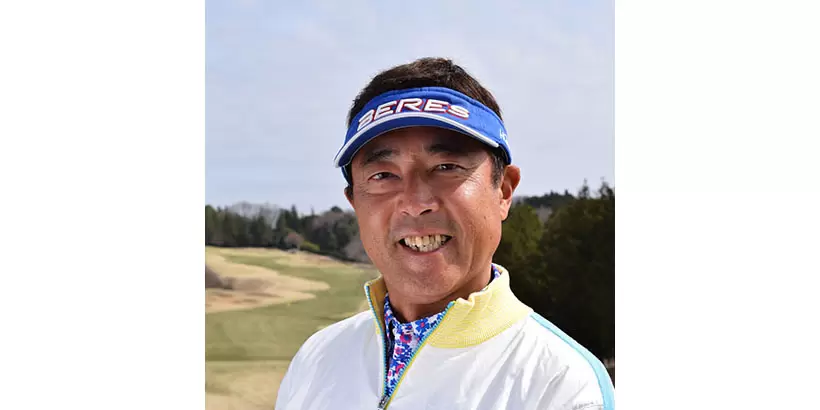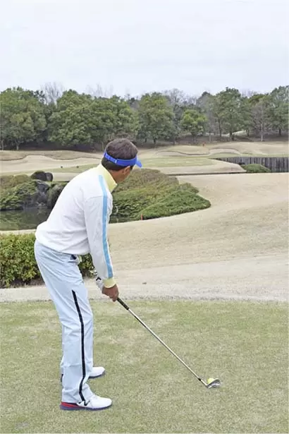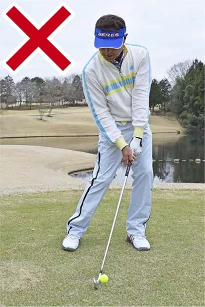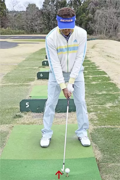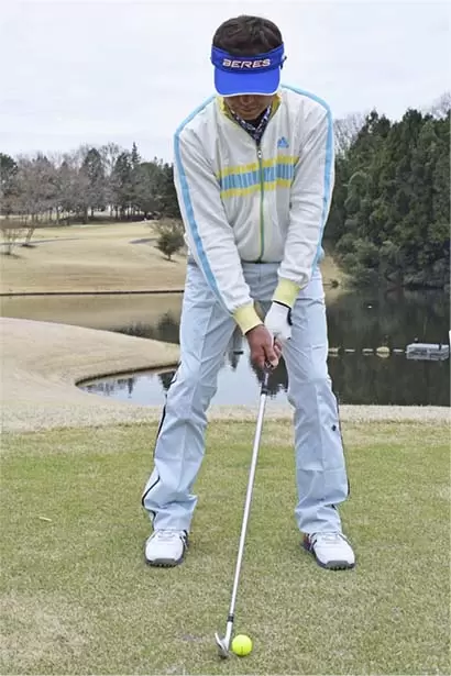ボールの位置はスタンスの中央。両手を左モモのツケ根の前にセットし、軽くハンドファーストに構える。