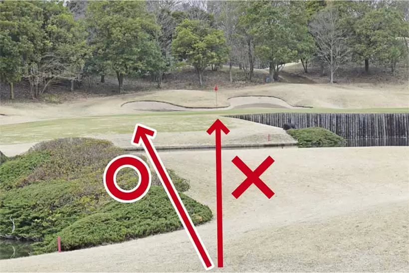 基本はグリーンの中央狙いだが、池越えとなる場合は手前にショートしても安全なエリアを狙おう。