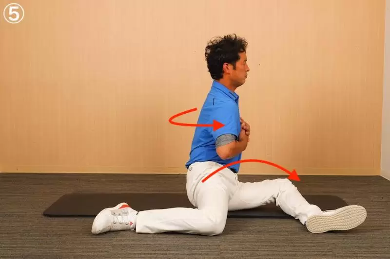 さらに左右を向いたところで胸を軽く張り上体を前に倒す。お尻の筋肉が伸びるのを感じる。