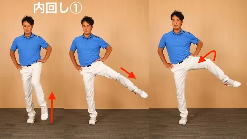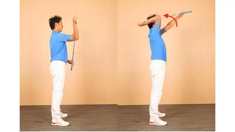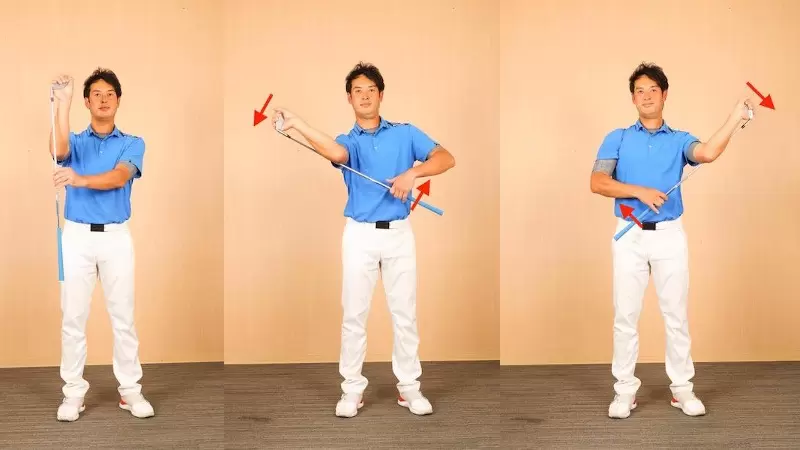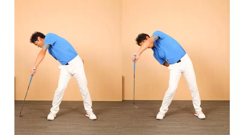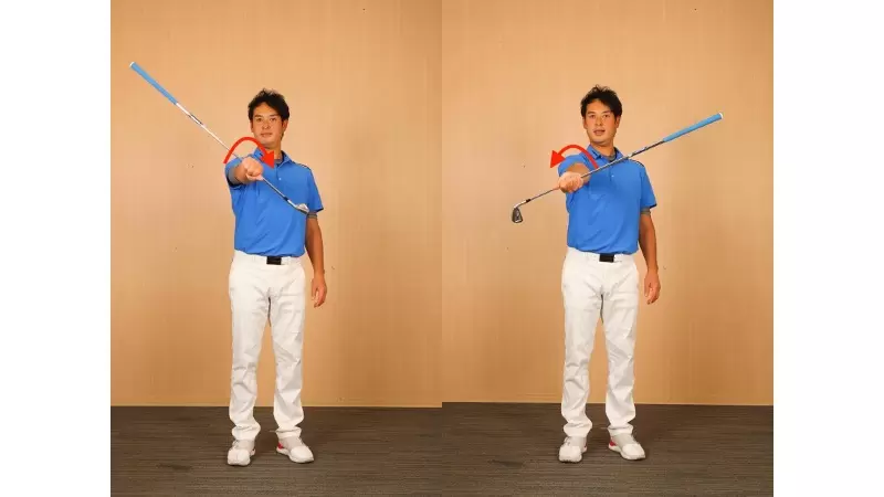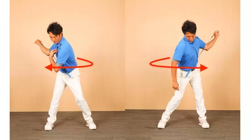左手でクラブを引きながら右腕を右に倒します。逆も同じように行います。