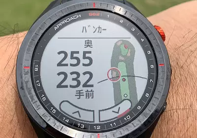ひと目でバンカーに入る距離とバンカーを越すための距離が分かる。画面下のボタンですぐに他のバンカーやハザードまでの距離に切り替えられる。