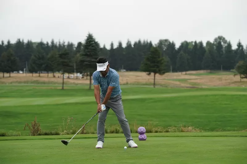両足のスタンス幅は肩幅より少し広いくらい。やはりドライバーはアッパーブローで打っていくイメージなので、上半身は右側にチルト(傾き)しています。そして、両腕は胸の上にしっかり乗って、ワキが締まりつつもリラックスしています。注目は右手・左手に一体感のあるグリップです。右手親指と人差し指のV字が右ワキを指しています。この一体感のあるグリップは参考にしたい点です。