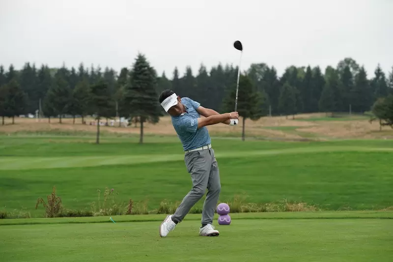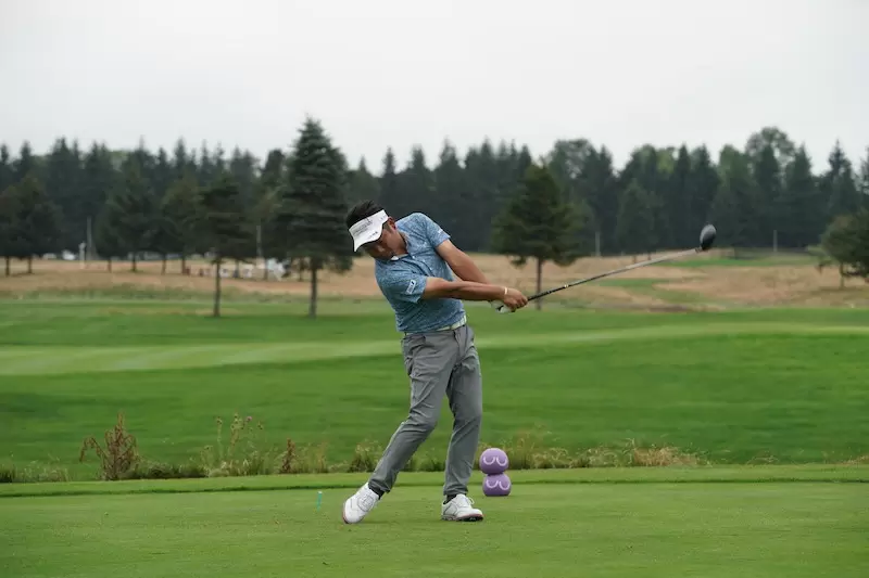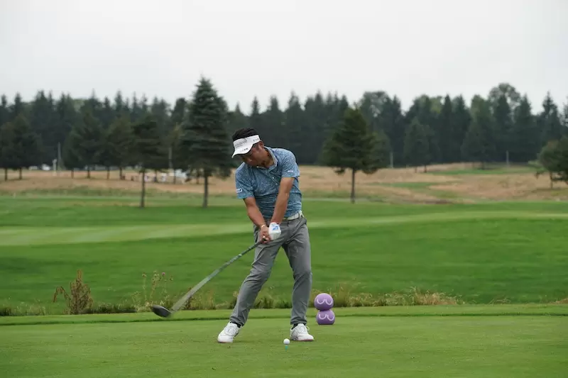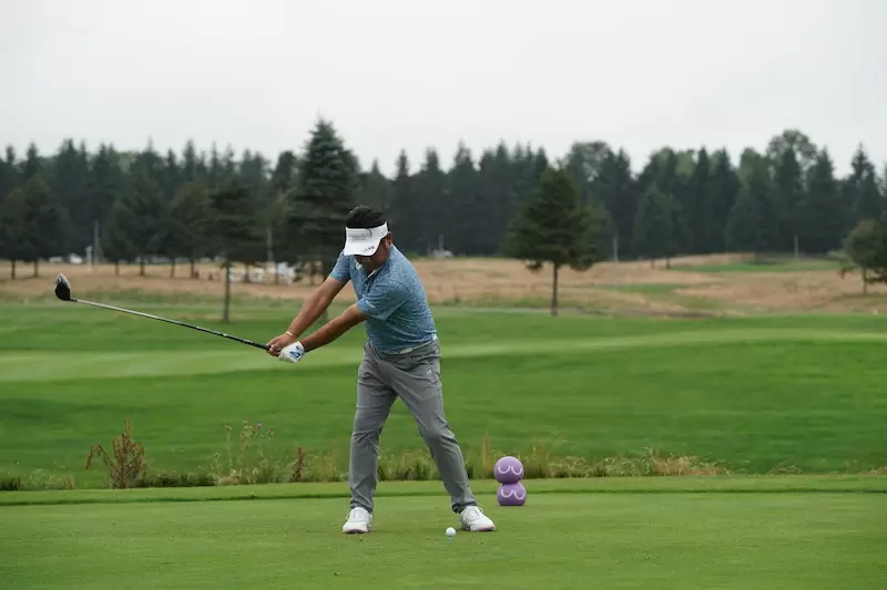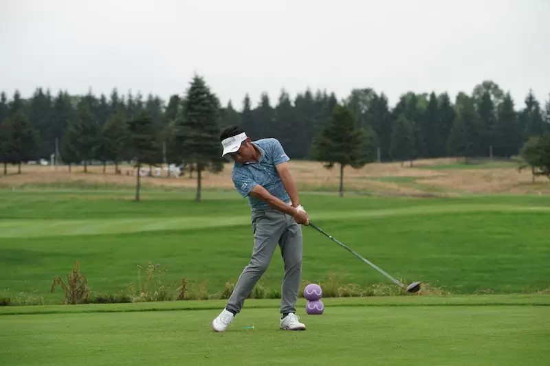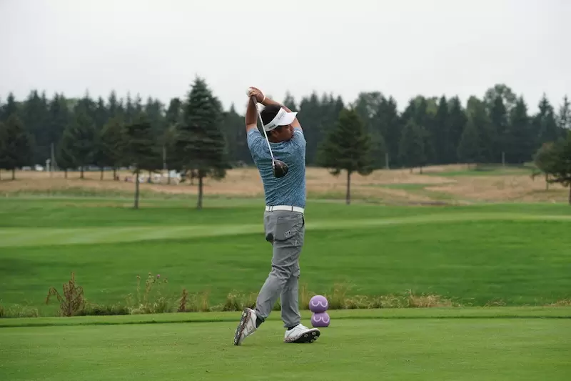 右足に体重をしっかりかけながらテークバックしていきます。そしてシャットフェースで、テークバック。ここもアマチュアが参考にすべきところです。手先や腕がローテーションしてしまうとクラブフェースは開いてしまい、結果的に飛距離ロスや曲がる要因となります。