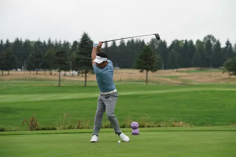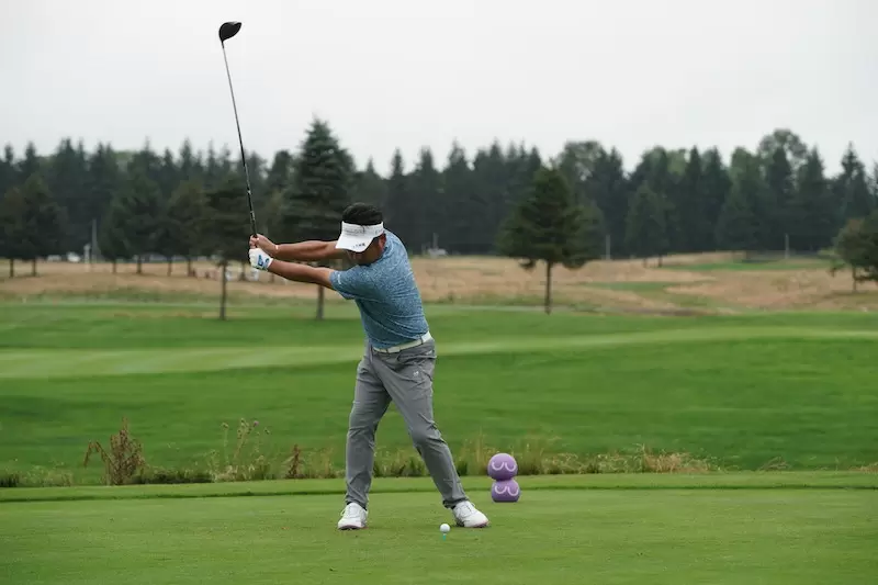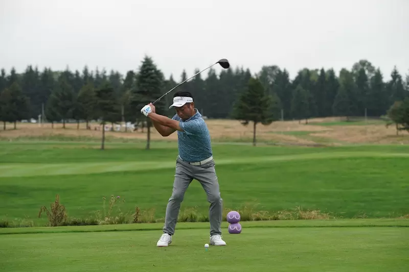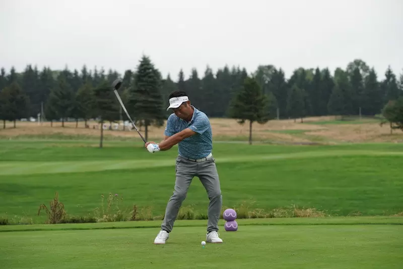 池田選手のダイナミックなスイングアークによって振り抜かれたフィニッシュは、両ヒジが肩よりも高いところに収まっています。これをマネしてみるとわかりますが、両ヒジの位置がかなり高いと思うはずです。