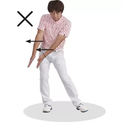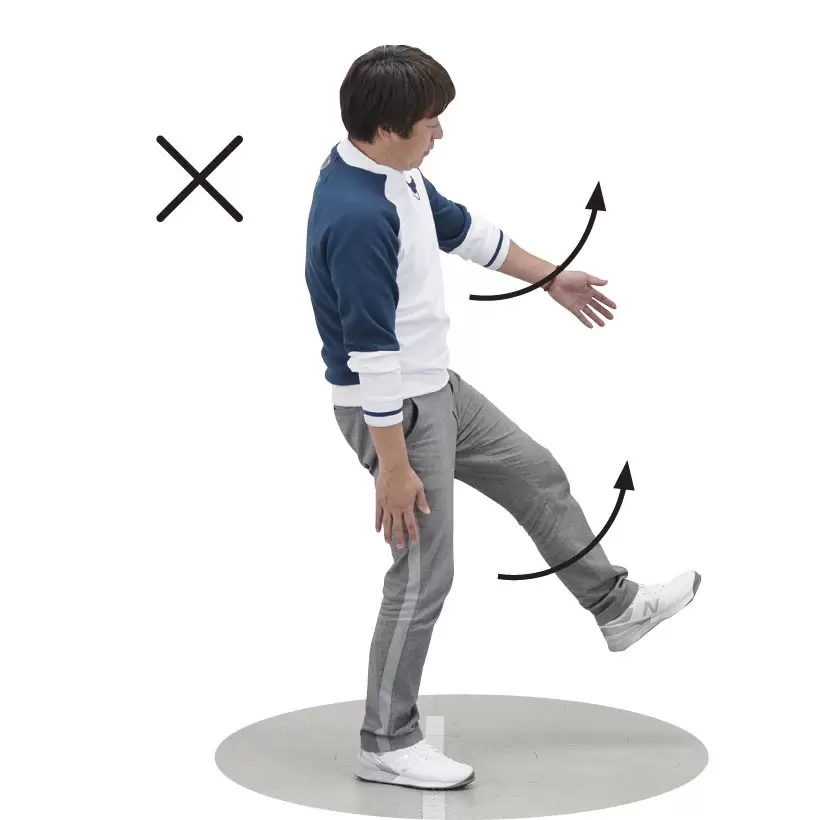 左手と左足が同時に前に出て、バランスを崩している、分離動作をしていない動き。おかしな動きだが、ゴルフスイングでは同様の動きをしている人が少なくない。