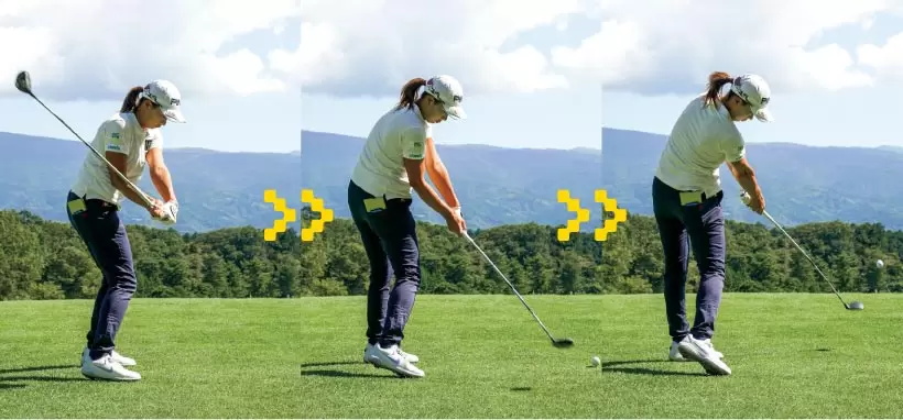 ダウンスイングは、ヘッドがボールに向かって一直線に下りてくるようなイメージを持つと体重が左に乗ったまま、ヘッドを低く出しやすくなる。