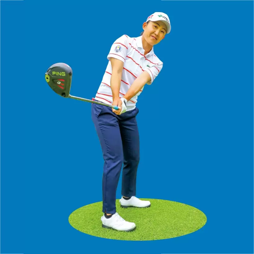 ダウンスイングでは手元を引きつけない。体の回転に合わせてクラブが下りてくるように、肩と腕をリラックスさせてスイングしよう。