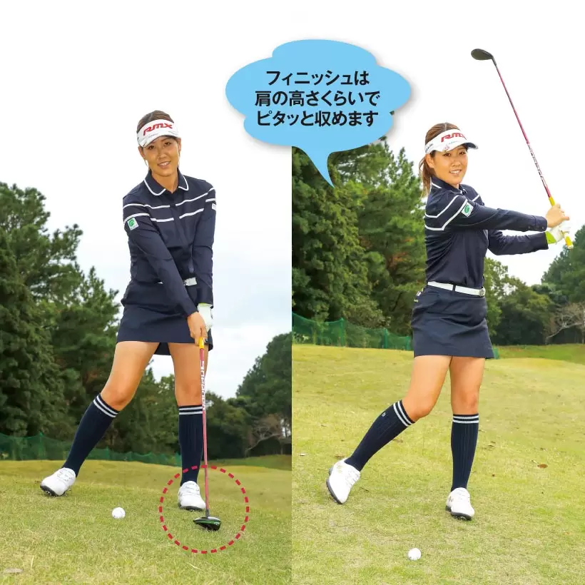 ヘッドを低く、そしてフィニッシュを小さく収めたい。そのためには、指2本分くらいクラブを短く持ってコントロールしやすくしよう。
