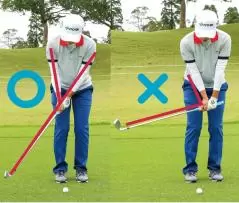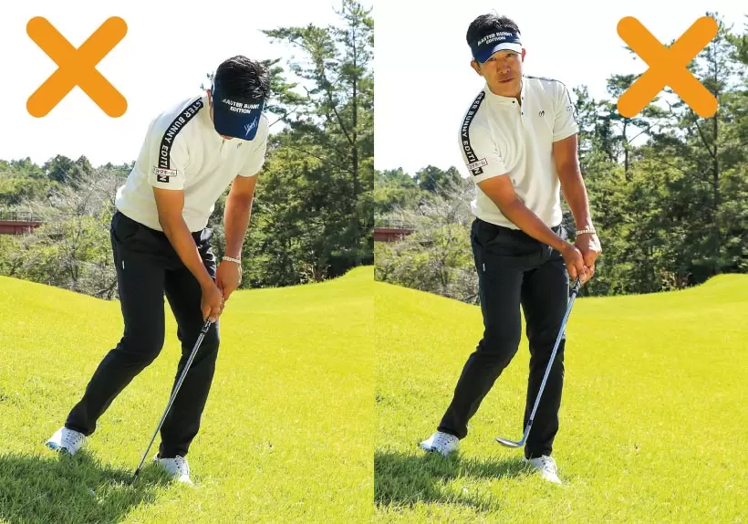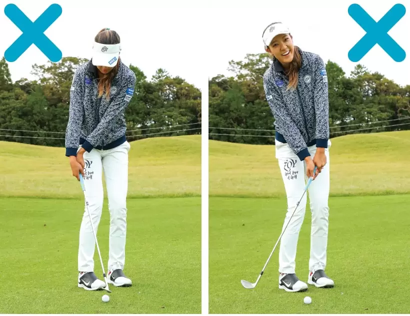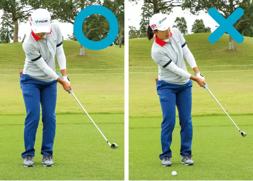 ボールを上げようとするとトップ(右)、しっかり当てようとしてヘッドが上から入るとインパクトでロフトが立って飛びすぎる(左)。
