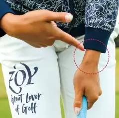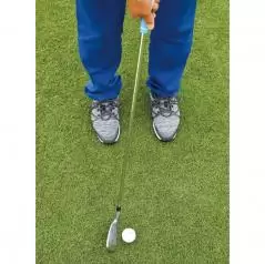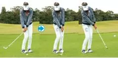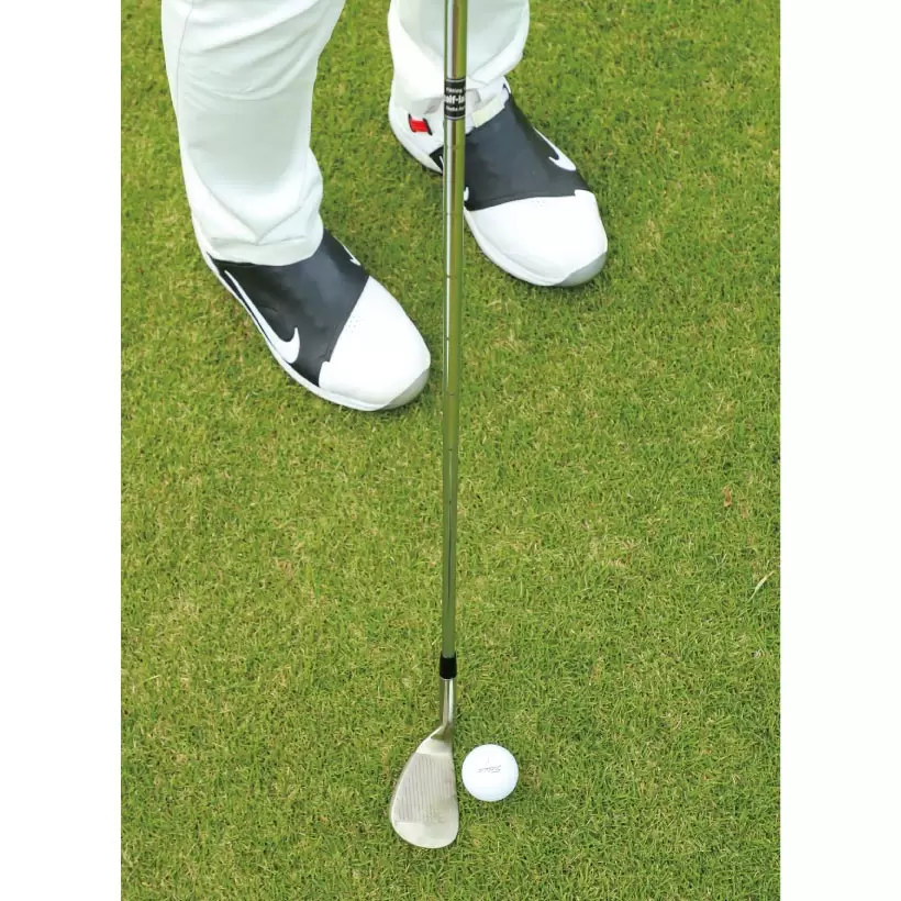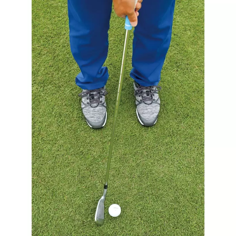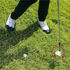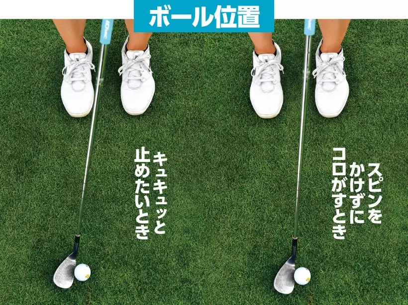 フェースの上を球がコロがることでバックスピンがかかるので、止めたい時はヘッドの入射角が鋭角になるように、右親指の延長線上に球をセットします。逆にコロがしたい時は、球を真ん中にセットして、ヘッドの最下点で球をとらえるようにします。