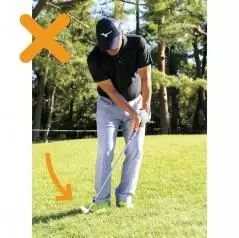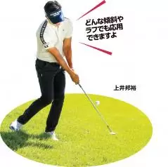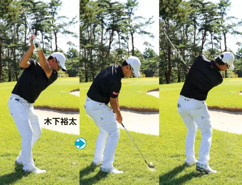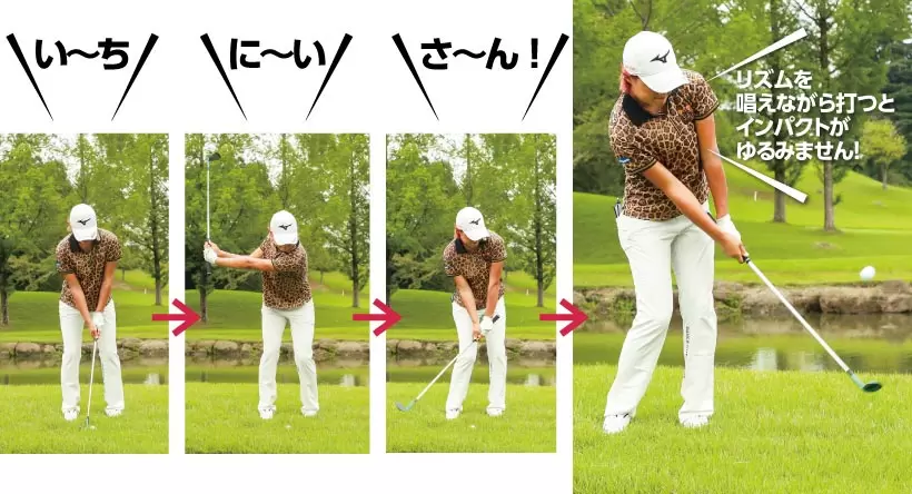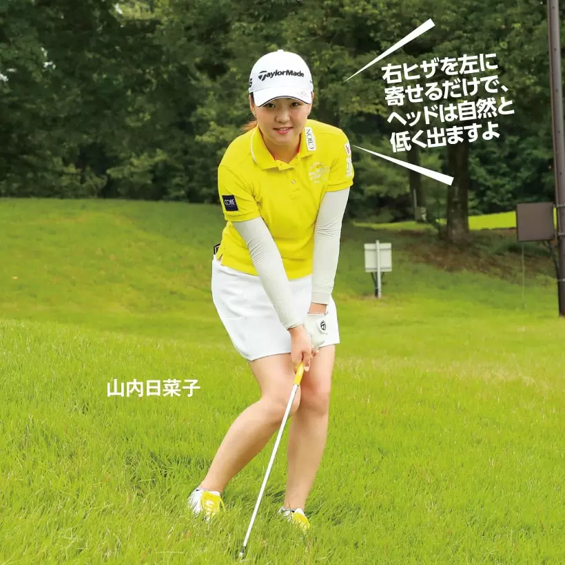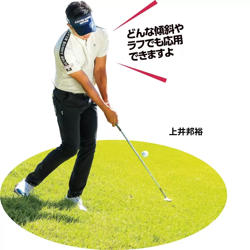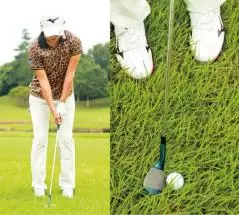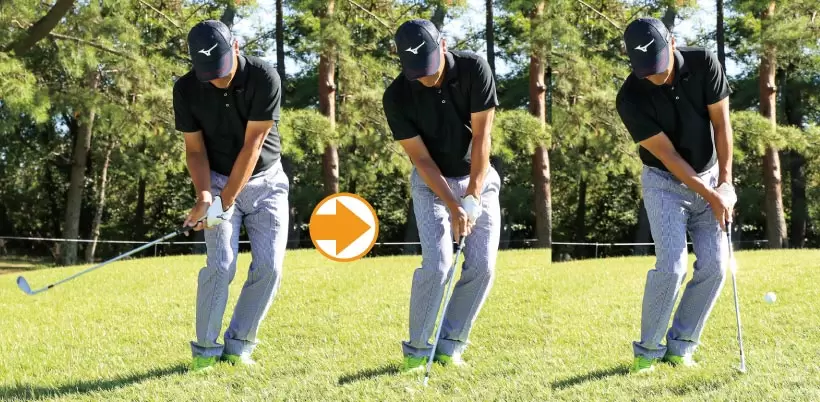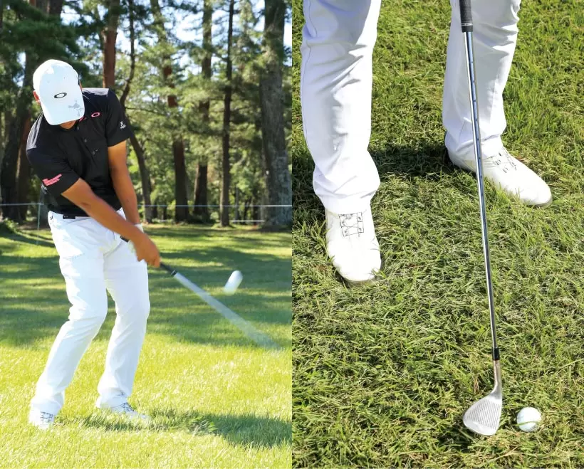 手首をコネたり、フォローを高くすると、芝の抵抗に負けてしまう。クラブは常に体と一緒に動かすイメージで振る。