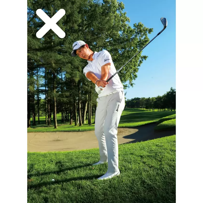 腕とクラブでできるY字を保ってテークバック。手首を使って上げない。