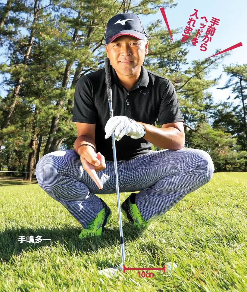 クラブを長く持つとヘッドをすくい打つような動きが出てしまうので、球がフケ上がるのを防ぐために、少し短めに持っています。