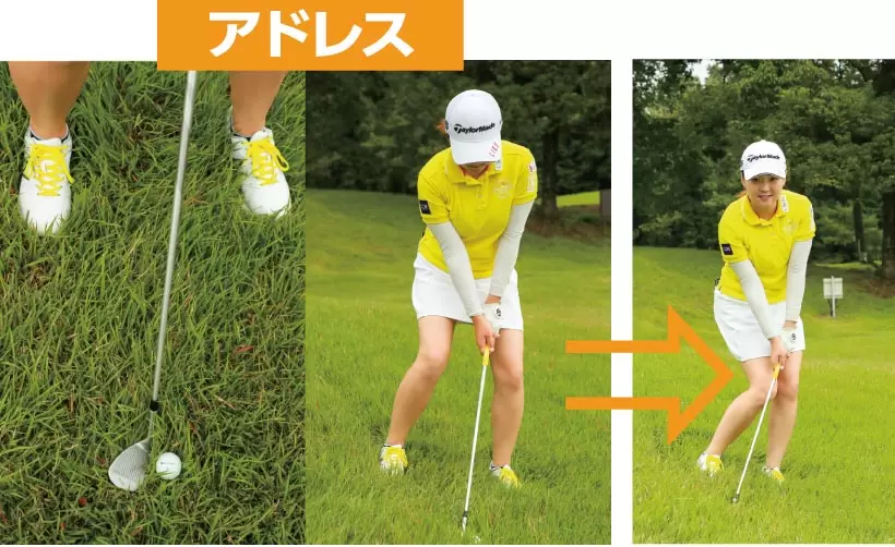 フェースを開き、スタンスを広めにとったら重心を下げてアドレス。左足体重になるが体ごと左に傾けないようにする。