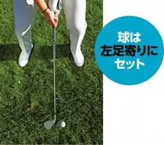 ヘッドの最下点を超えてからインパクトするために、最初から球を左足寄りにセットする。