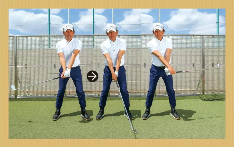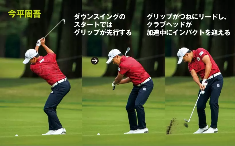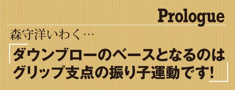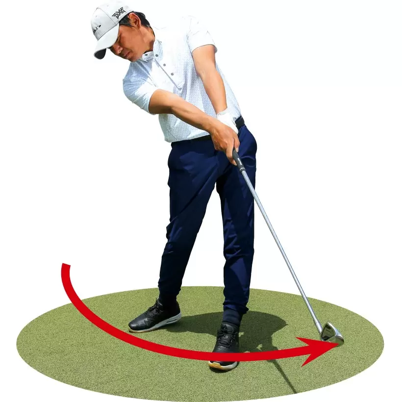 スイングは第一振り子と第二振り子の連動が大切だが、クラブが進みたがる方向にまかせて振る第一振り子の動きがリードしなくてはならない。体を回すことばかりに意識がいくとダウンブローに打てないのだ。