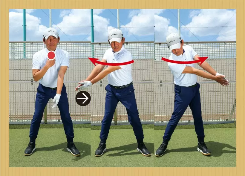 同じようにクラブを右手に持ち、左腕を前に伸ばした体勢で素振りしよう。クラブの動きに委ねれば右腕が自然に回旋しながら伸びる。