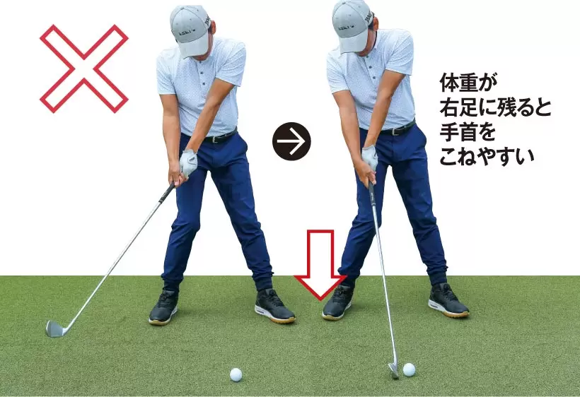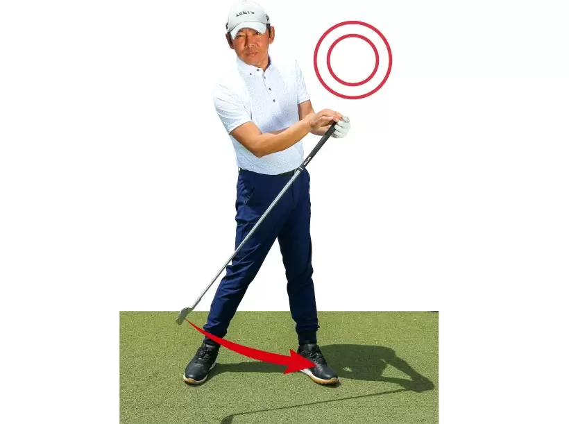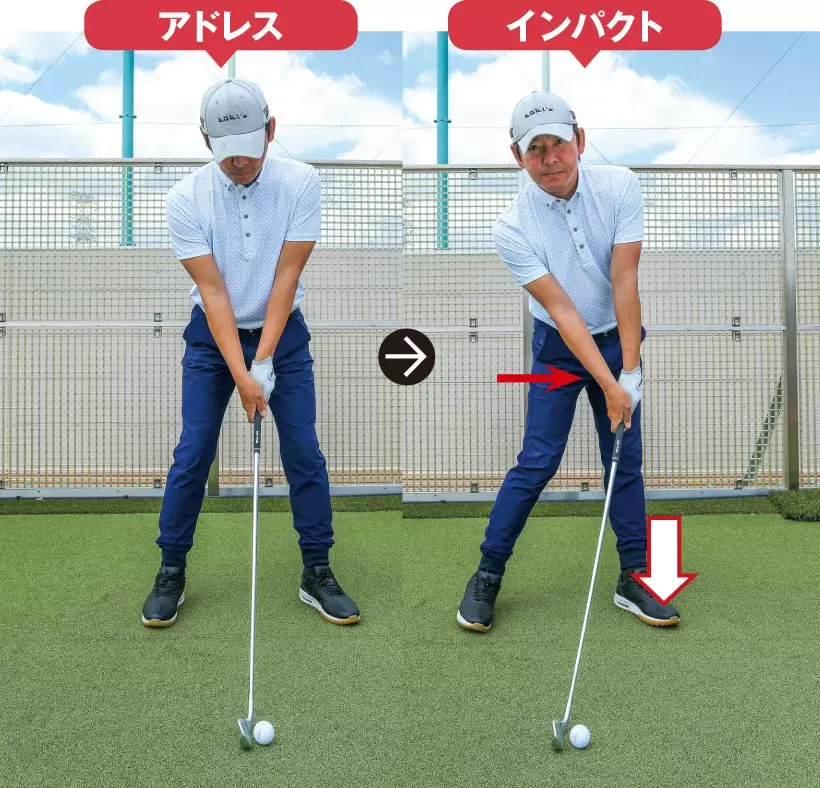 体重を左足に乗せてグリップを目標寄りに移動させてインパクトするのが基本。